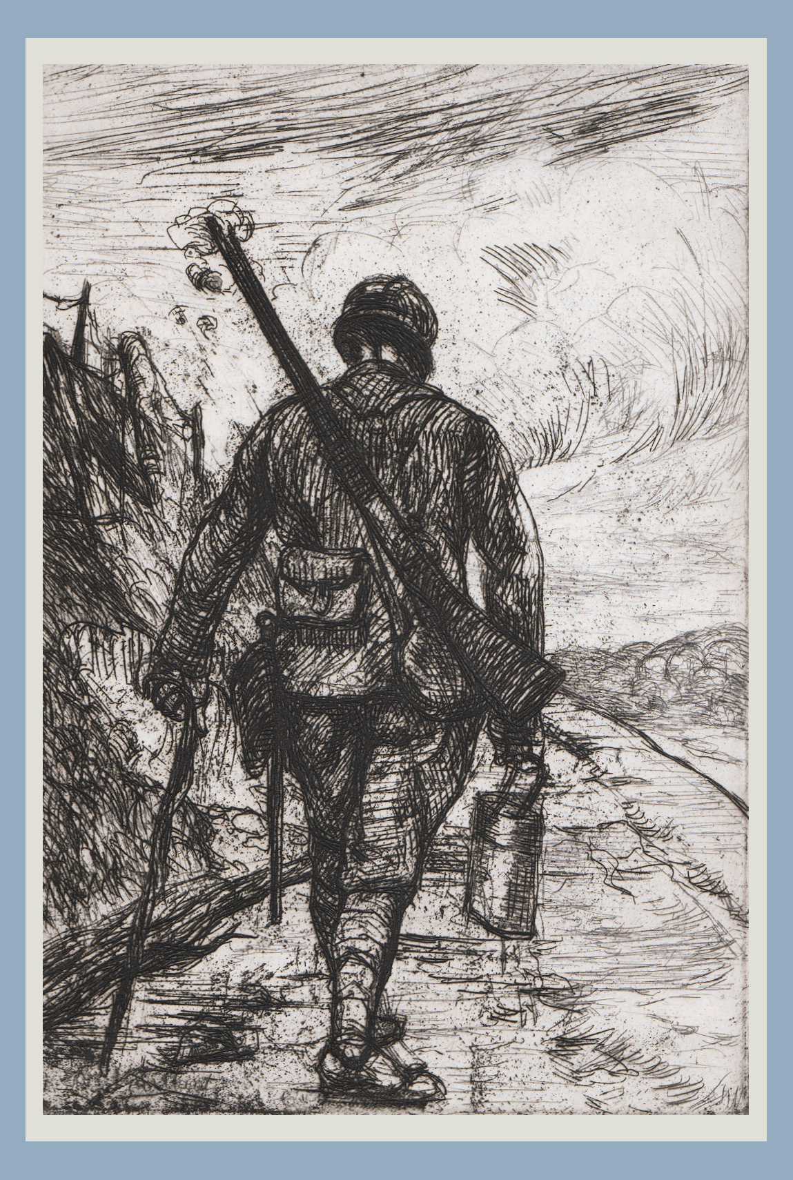 Le poilu progresse aidé de sa canne. Le bouthéon doit contenir du café préparé pour les hommes d’une position. Sur la gauche, des fils de fer barbelés ; devant, un chemin dégagé.