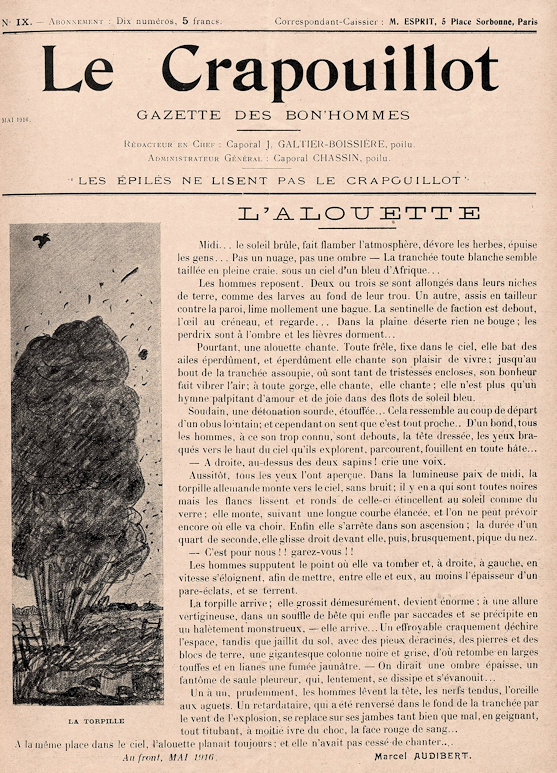 Les dessins qui paraissent dans Le Crapouillot de Galtier-Boissiere (de août 1916 à novembre 1918) comptent également de nombreux portraits, mais souvent plus aboutis. Le travail très maîtrisé du dessin à la plume permet de suggérer autant des atmosphères parfois oppressantes comme dans « Sur la route… de Saint-Quentin, 1917 », paru en avril 1918, que l’intimité de soldats seuls ou en groupe, la plupart du temps sans décor. Dans Le Crapouillot, paraissent aussi, entre autres, des dessins de Guy Arnoux, Luc-Albert Moreau, Charles Martin ou Jean Galtier-Boissière ; ce dernier étant le fondateur de ce qui est alors une « gazette poilue » dédiée à combattre le « bourrage de crâne ». Ce combat, Le Crapouillot le mène dans ses articles parfois censurés mais aussi avec l’aide des dessins de ces artistes mobilisés. Le dessin, s’avère être la technique permettant une réalisation rapide sur le terrain par l’observation directe des faits et des acteurs de la guerre, bien éloigné des contraintes qui accompagne la production d’œuvres peintes. Ainsi, le journal se positionne comme défenseur des artistes combattants. On peut y lire, notamment, en novembre 1917, sous la plume du critique Le Rousseur :