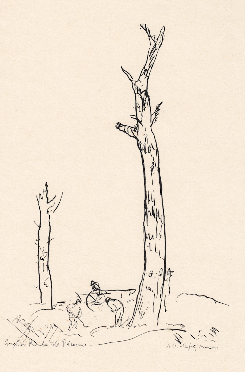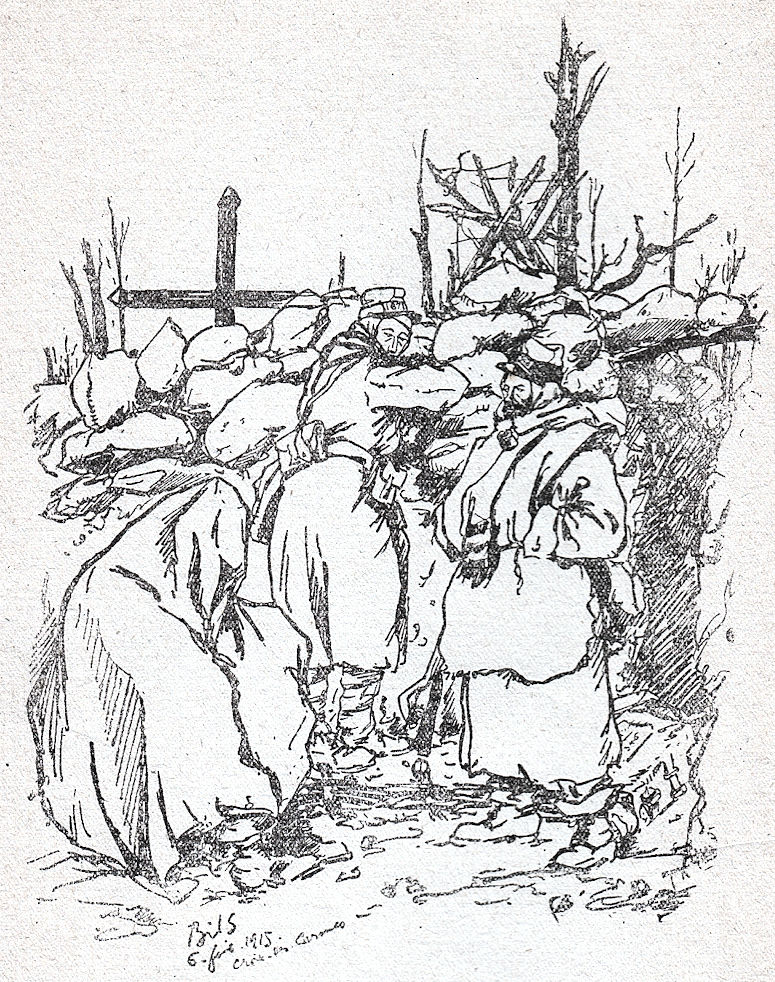 « J’avais emporté des carnets de dessin, des plumes et de l’encre de Chine, ce qui m’a permis, dès août 14, d’exécuter de nombreux croquis dans la guerre de mouvement en août, septembre et octobre, et plus tard, la guerre s’étant stabilisé, dans les tranchées et les cantonnements de la région du Bois-le-Prêtre.