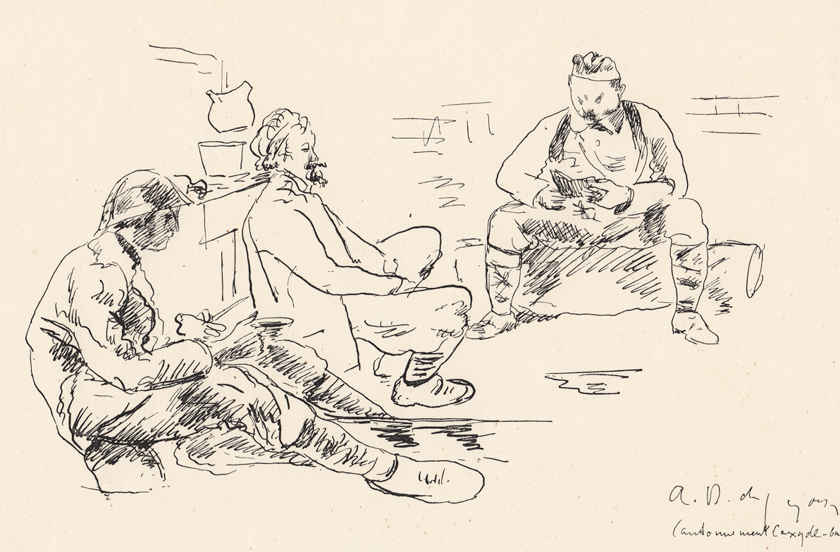Segonzac a utilisé de façon répétée le lavis sur ses dessins de guerre et plus rarement, comme ici, l’aquarelle.