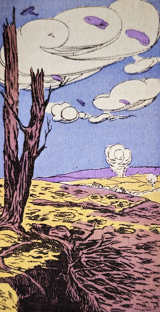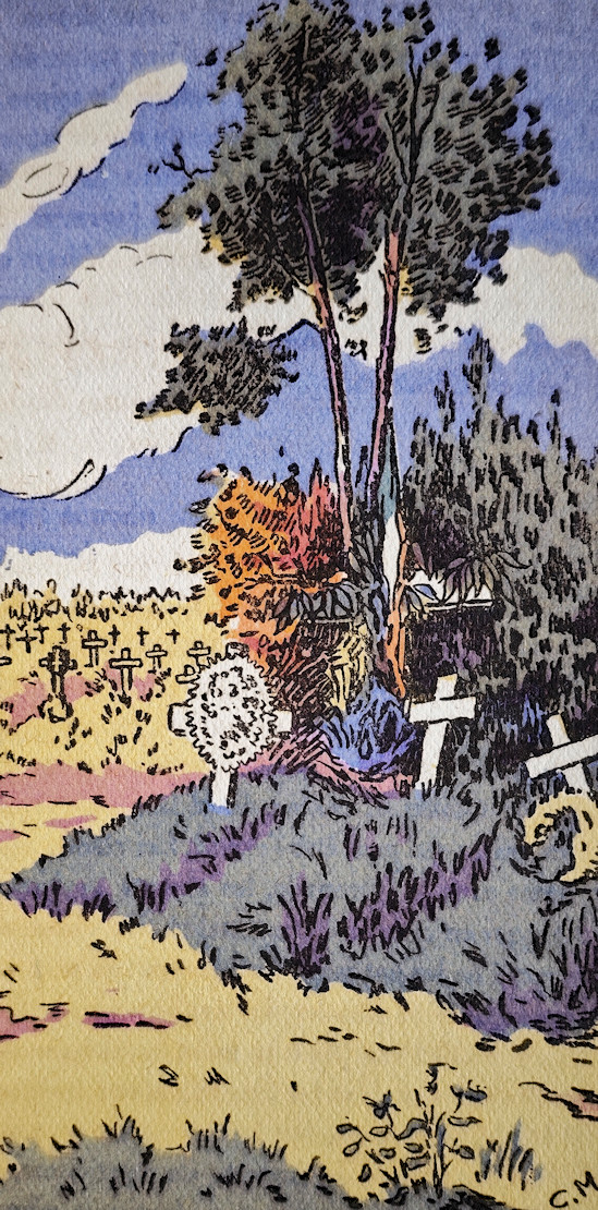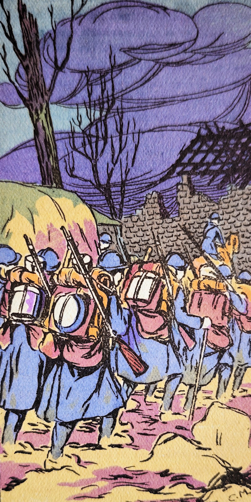 Les cinq petites illustrations de l’article sont signées Claude Marc (pas d’information sur cet artiste) et sont issues de Les images meurtries 1914 1918 de L. Ch. Watelin, éditions Marcel Pagé, Paris, 1918