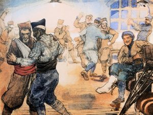 Un autre instant de détente est celui représenté dans cette belle aquarelle intitulée Le moral est toujours bon (fig. 16). Une scène que l’on peut rapprocher des dessins réalisés par Valentine Rau à l’occasion d’un concert donné à l’hôpital Corbineau et qui met en scène comme ici une forme de plaisir collectif autour de la musique.
